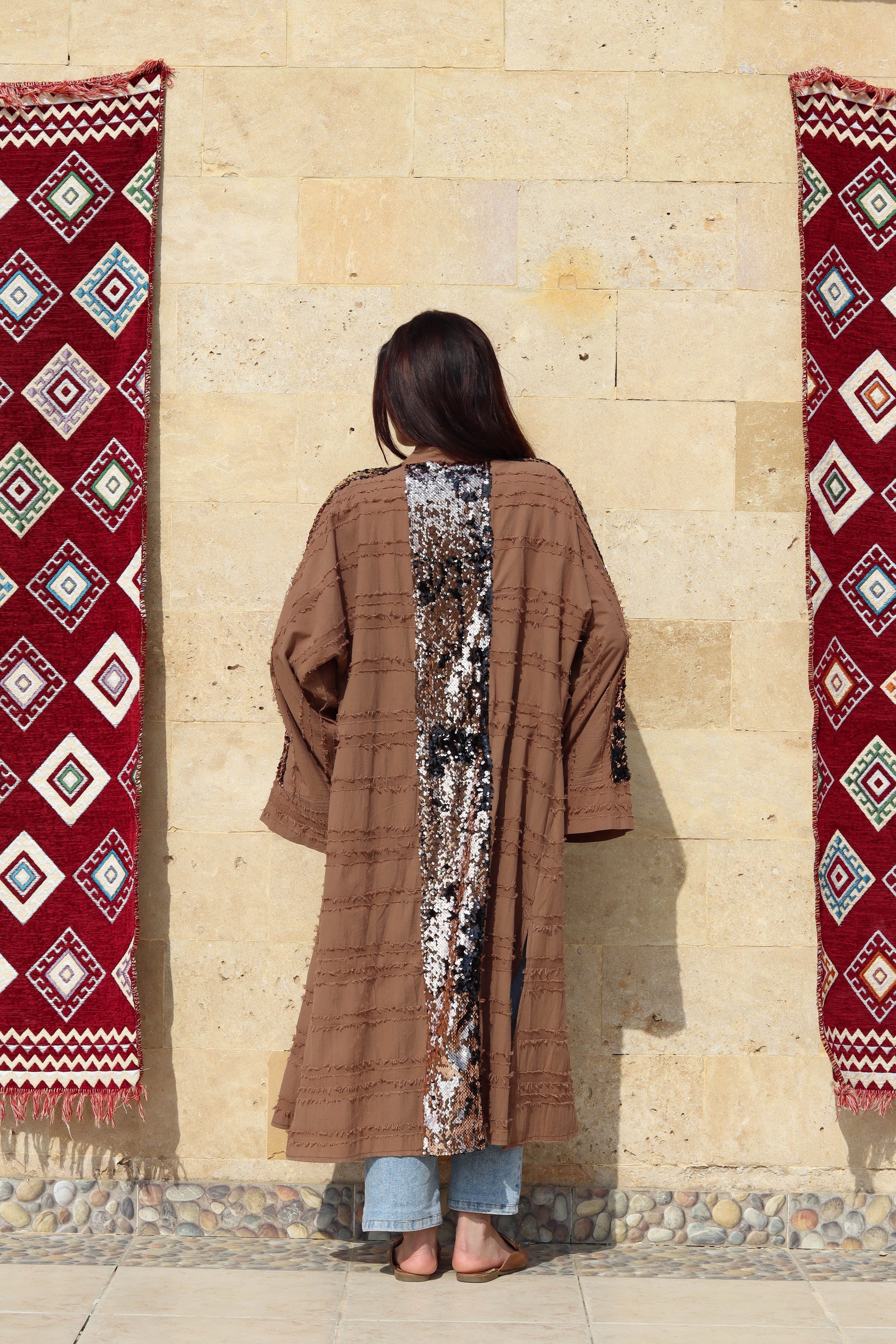 A fringy kimono with full sleeves, & sequins on the back & sleeves, made of a Fringy linen material, suitable for a statement yet everyday look 🤎
