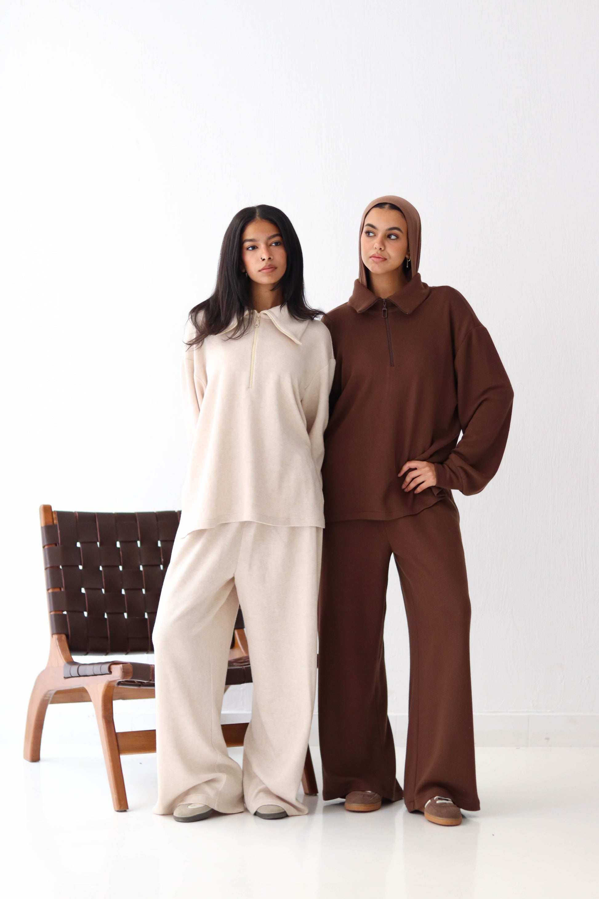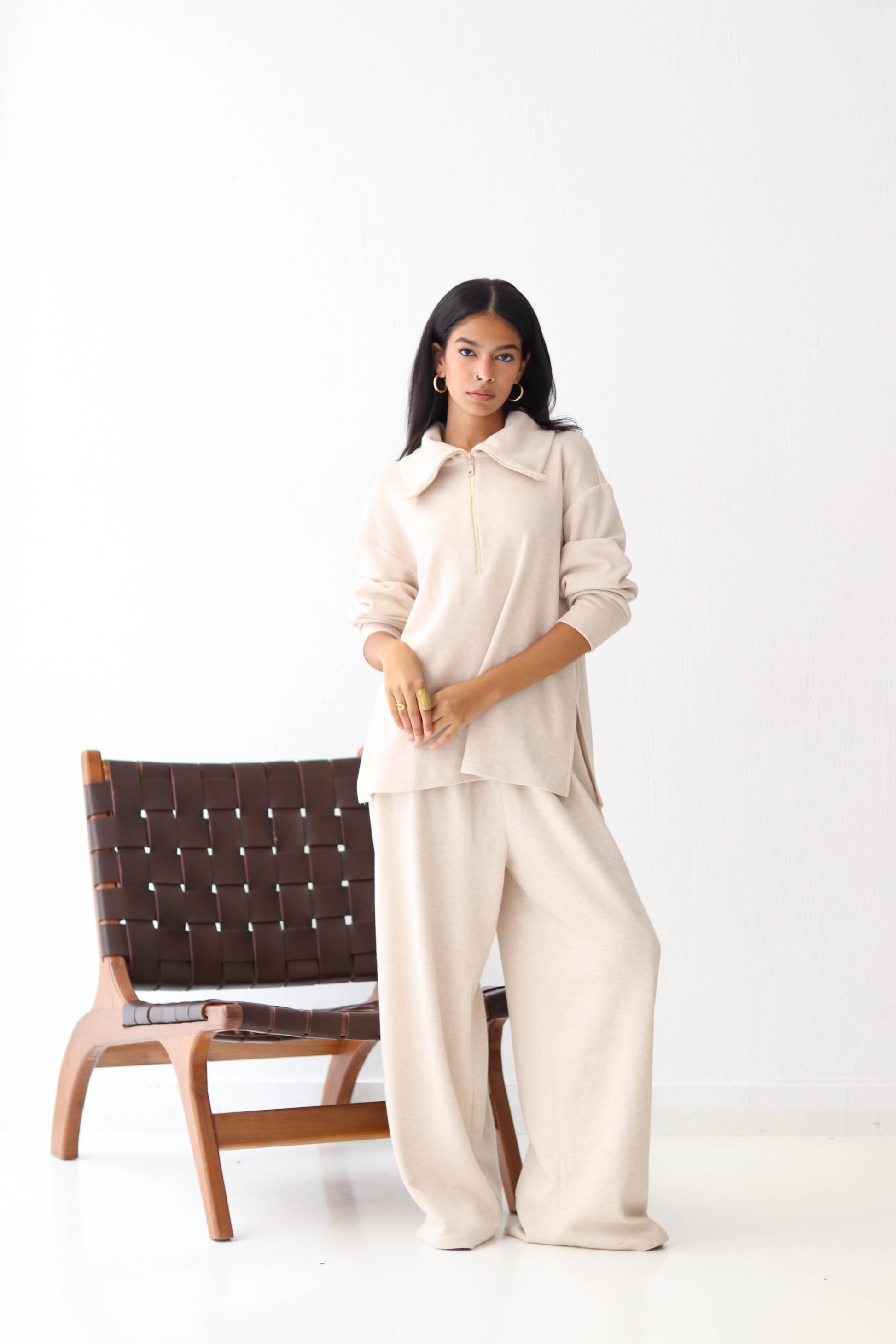 A relaxed fit co-ord set , that comes in a half zip collared sweater & wide pants.