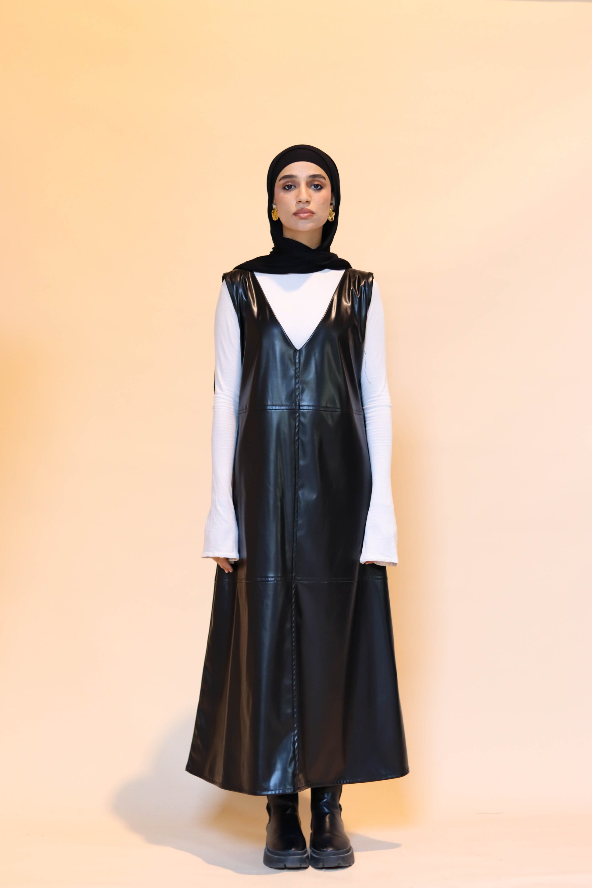 A sleeveless midi dress with V neck & leather details, your not so basic leather piece for a bold look.