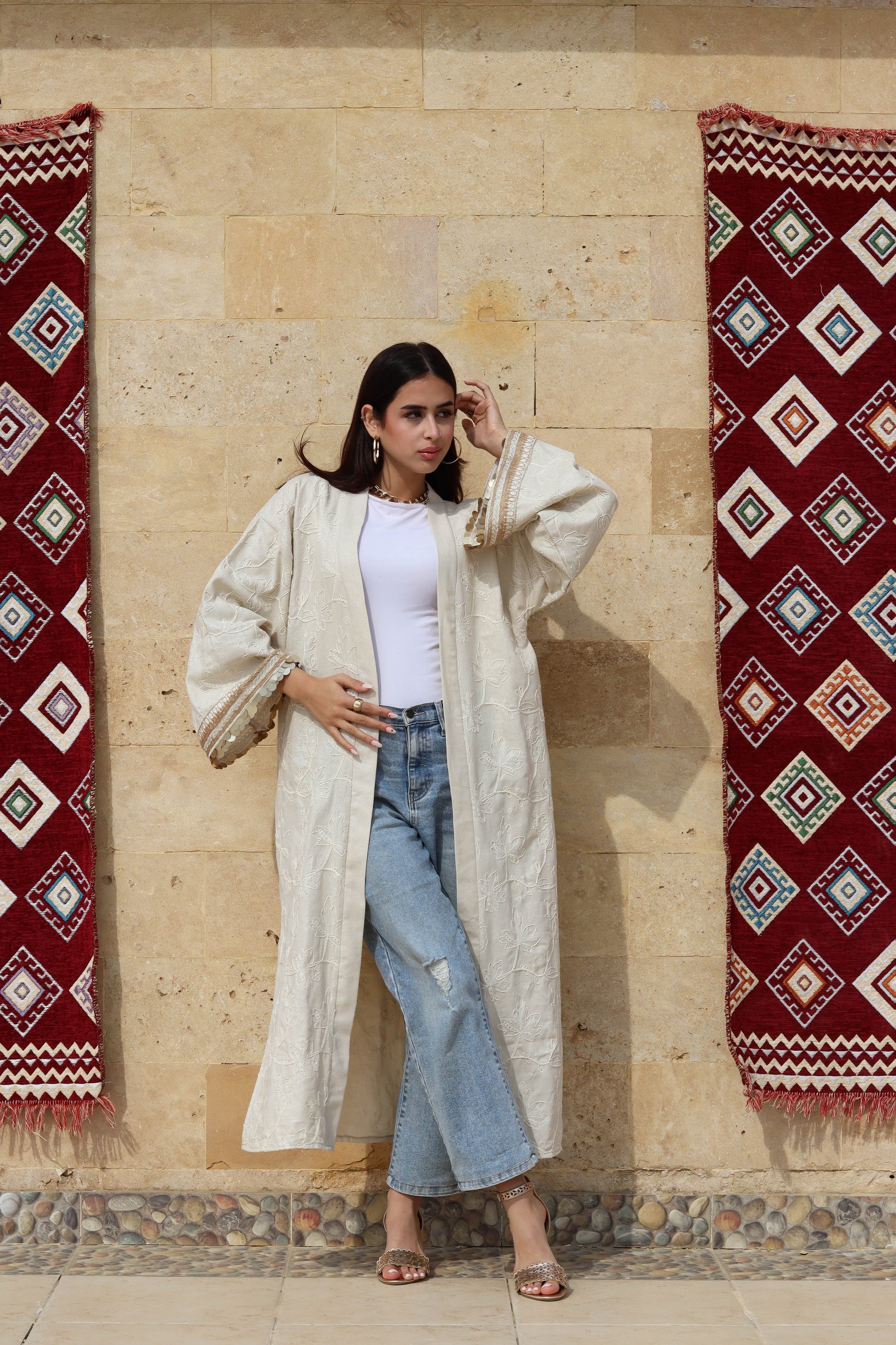 An embroidered kaftan/kimono, with sequins details, that has full sleeves & 2 side slits, made of fancy embroidered linen, with simple details that makes it suitable to wear all year long.