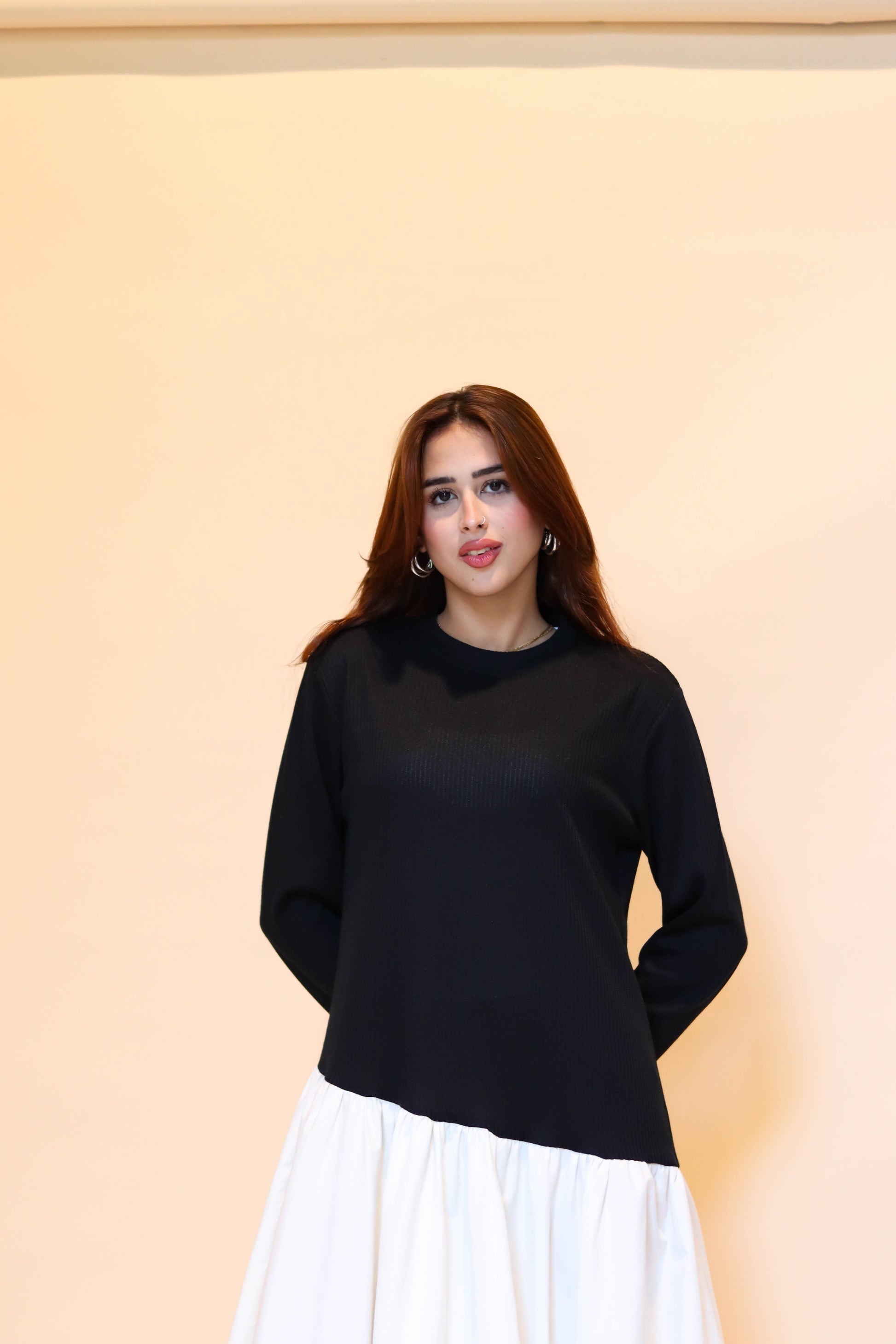 A voluminous maxi dress with a parachute hem made of lined poplin suitable for winter, asymmetric waistline, & full sleeves.
