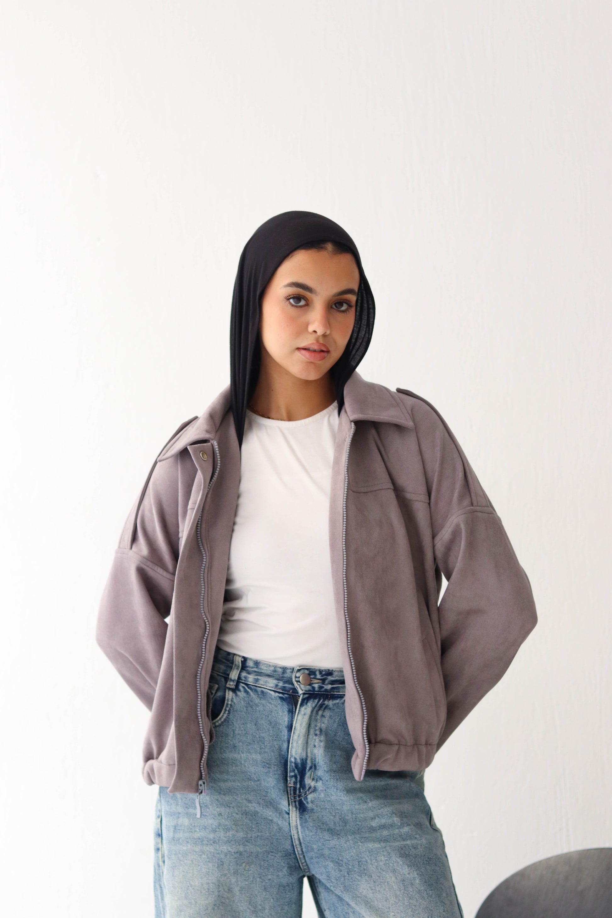 A relaxed bomber jacket, with full sleeves, & a zipper.