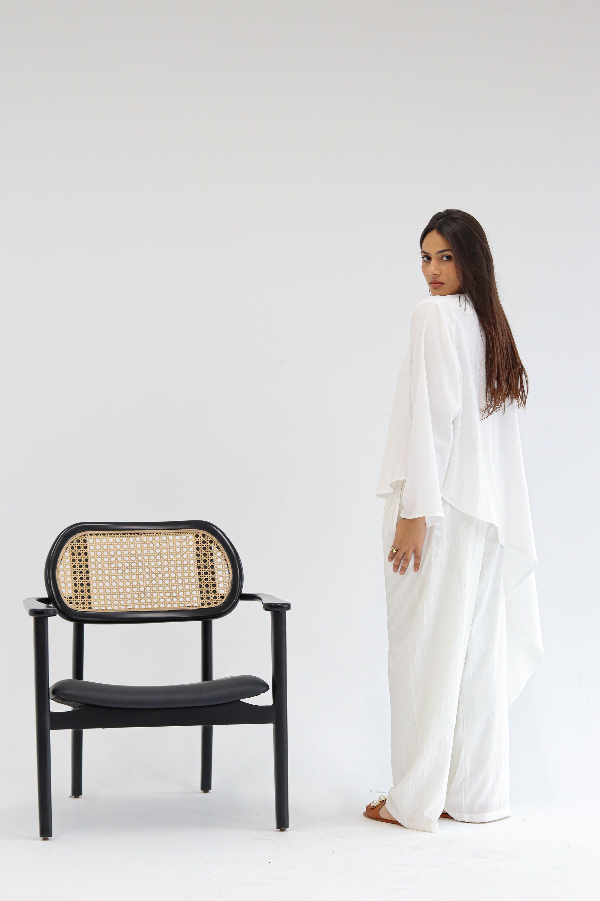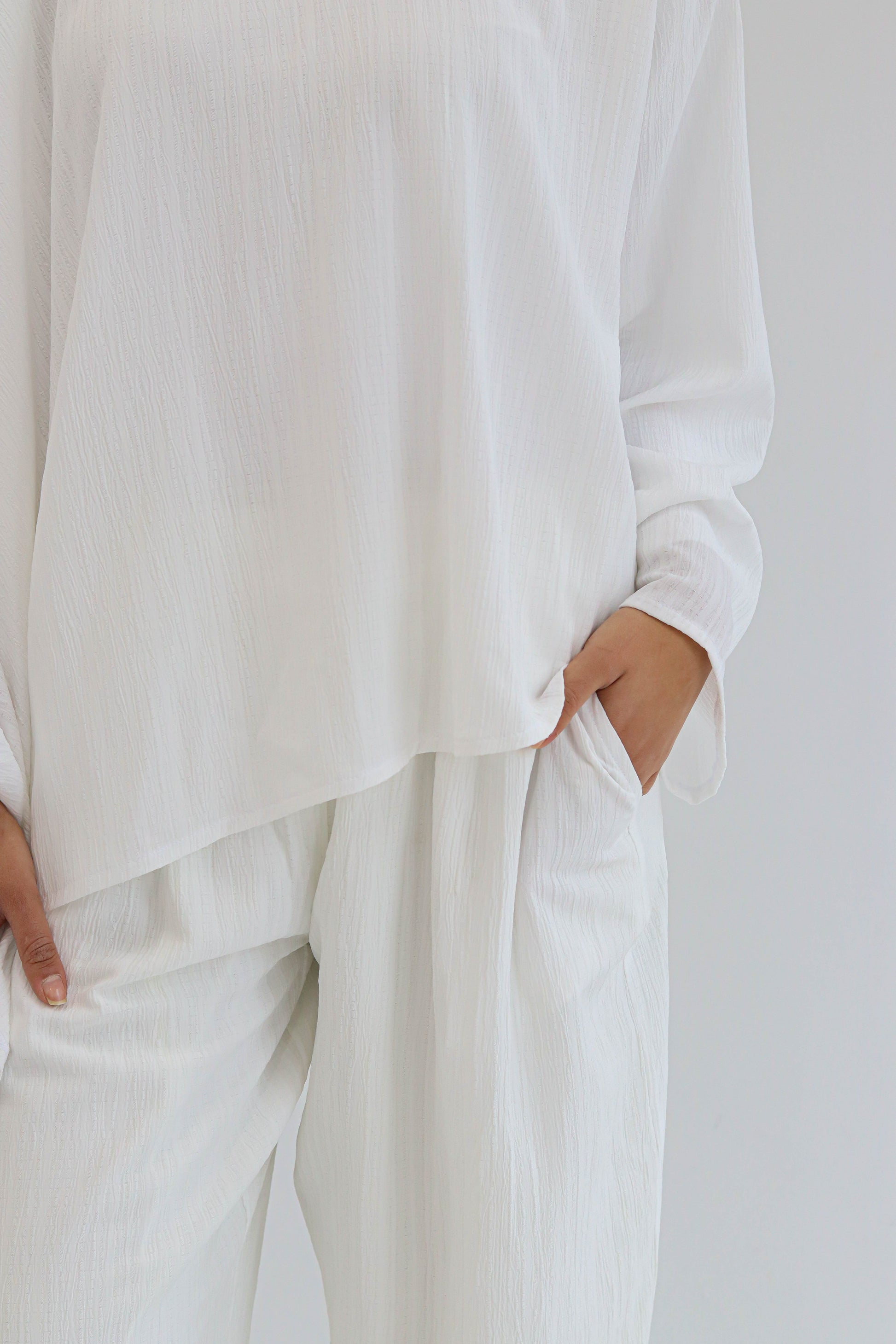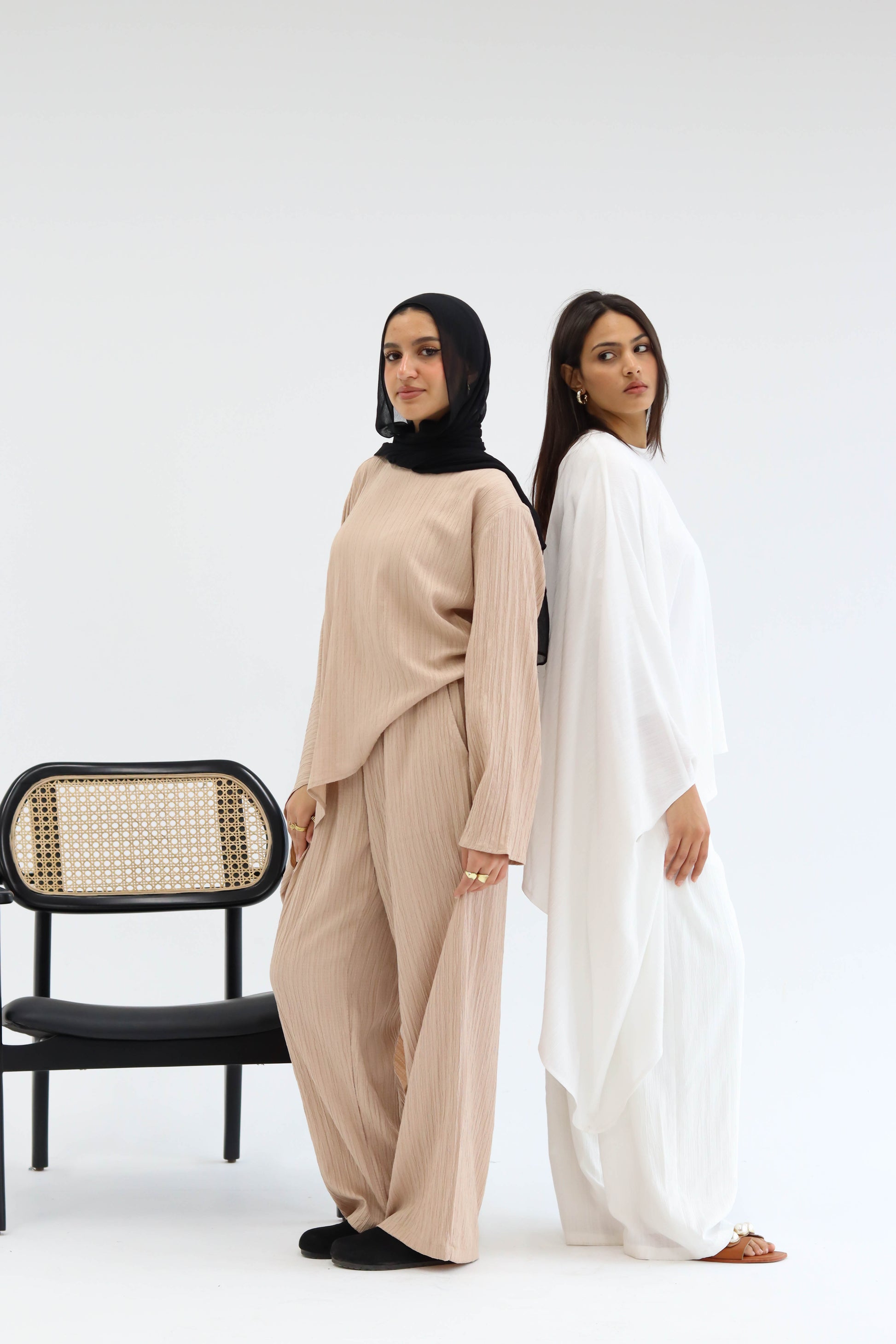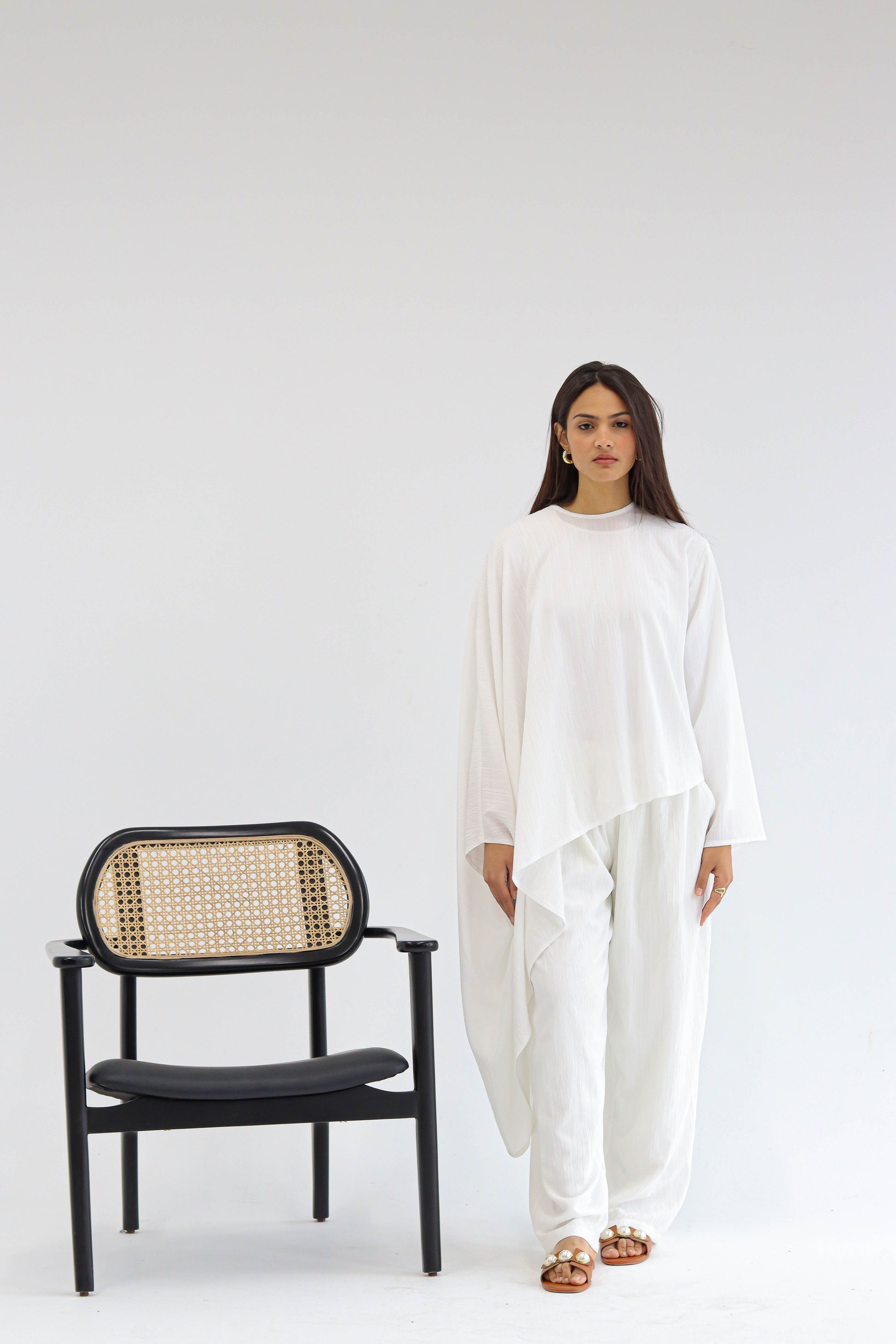 A Matching crinkled co-ord set, you can style in many different ways, it has an asymmetric top & wide leg pants.